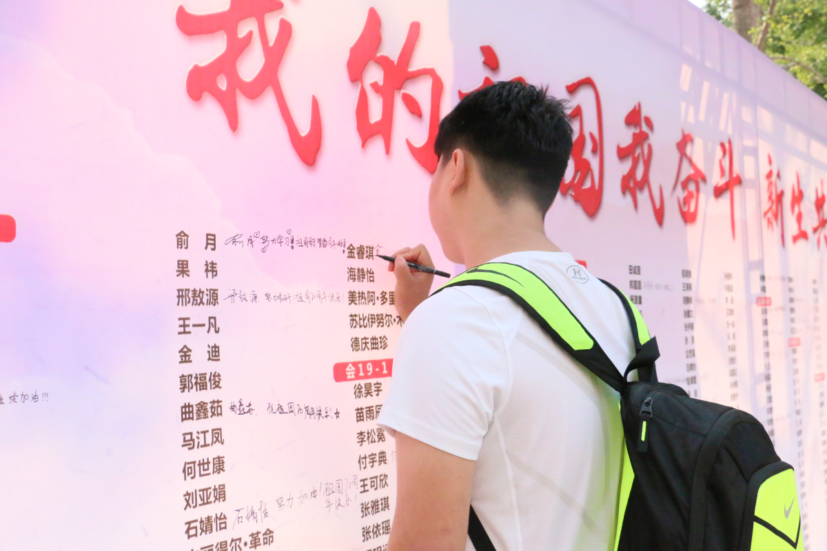 “我的祖国我奋斗,新生共话新生活”,在今年“共话新生活”新生志愿服务活动中,每位新生都在合影签名墙上签下了自己的名字,并写下了对祖国70华诞的祝福和对个人成长的希望。此外,很多同学纷纷和自己的父母在合影墙处拍照留念,纪念这一有意义的时刻。新生志愿者活动作为经管学院的传统品牌活动之一,深受广大师生的喜爱。今年学院共有52名新生志愿者参与到迎新工作中,通过迎新活动,培养了新同学们的主人翁意识,同时也影响了周围更多同学。