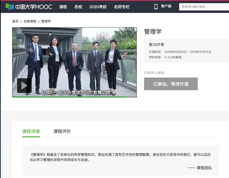 近日,我校《管理学》课程在“中国大学MOOC”平台成功上线,该课程将于9月23日正式开课,是我校首次在国内主流MOOC平台上线管理类的相关MOOC课程。该课程由北京市教学名师、太阳成集团tyc33455院长赵继新教授任课程负责人,郑强国、魏秀丽、罗文豪、张淑谦四位老师任成员。